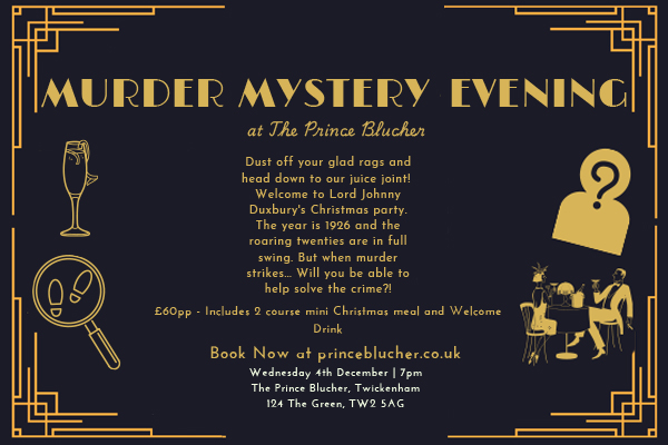 04 Dec 24Join us for our 1st Murder Mystery event at the Blucher! Step into the role of detective and dive into an intriguing 1920s-themed plot. Dress up alongside our staff and put your investigative skills to the test! The evening includes a three-course meal, and while early bird tickets come with a welcome drink, regular tickets are £50 per person. You can book online or pop in to secure your spot!